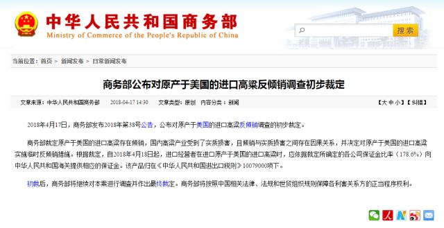 2018年4月17日,商务部发布2018年第38号公告,公布对原产于美国的进口高粱反倾销调查的初步裁定。