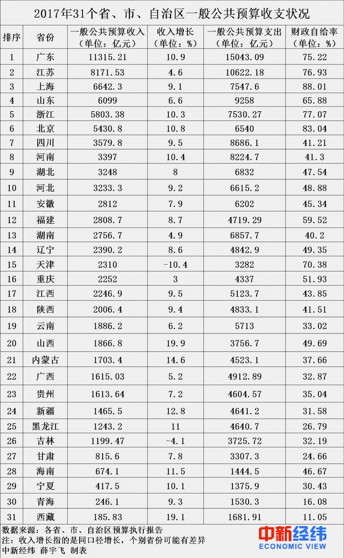 中新经纬客户端5月31日电(薛宇飞) 财政收入,是一个行政区域硬实力的体现,决定着这个区域在城市建设、民生支出等方面的投入,而一般公共预算收入则是财政收入重要的组成部分。根据各地2017年预算执行报告统计,广东、江苏、上海三地的一般公共预算收入位居前三甲,广东省更是高达1.31多万亿元;增速上,山西、西藏、内蒙古增长较快,吉林、天津出现负增长;财政自给率方面,东高西低的态势十分明显。