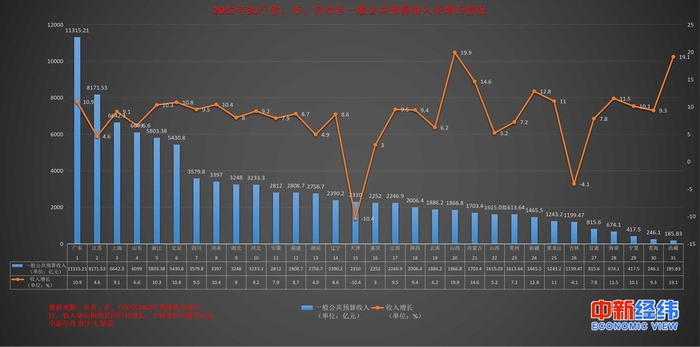 2017年31个省市自治区一般公共预算收入及增长情况 数据来源:各省市自治区预算执行报告 注:收入增长指的是同口径增长,个别省份可能有差异 中新经纬 薛宇飞制表