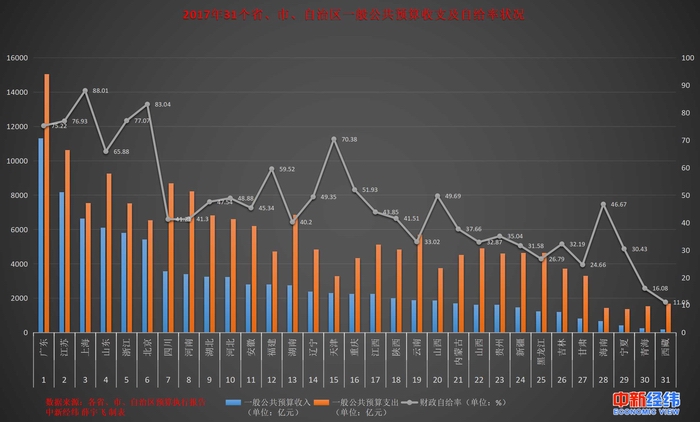 2017年31个省市自治区一般公共预算收支及自给率状况 数据来源:各省市自治区预算执行报告 中新经纬 薛宇飞制表
